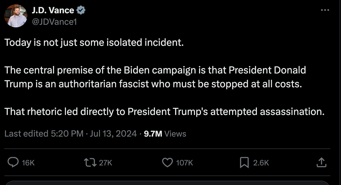 Citing a Biden quote from a recent fundraiser, Congressman Mark Collins tweeted that Biden “sent the order.” Marjorie Taylor Greene, Elon Musk, and other Trump supporters blamed Democrats, the media, the Deep State, and DEI (seriously). This all to keep the GOP base turned up to an 11, while chastising Democrats for their appropriate messaging about Trump.