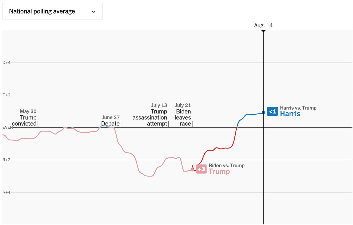According to the New York Times polling average, Harris is up about a point nationally. This is a huge shift: