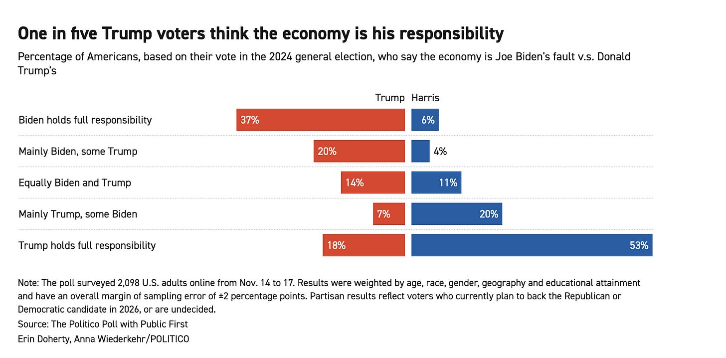 A Politico poll found that 46% of voters — including 15% of 2024 Trump voters — say Trump is fully or primarily responsible for the state of the economy. Only 29% blame Biden.